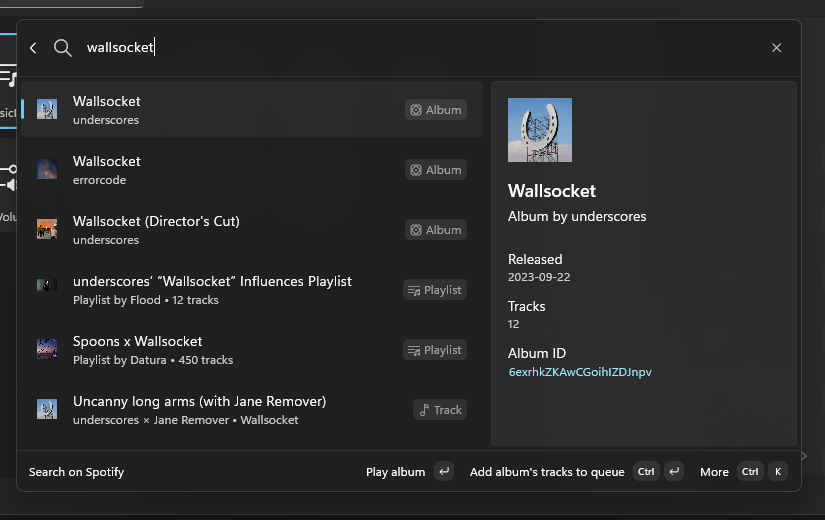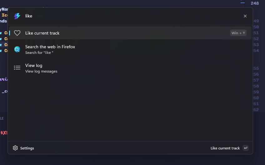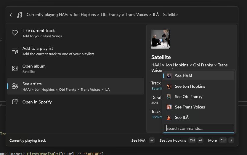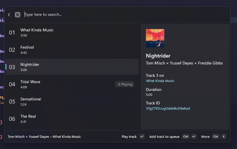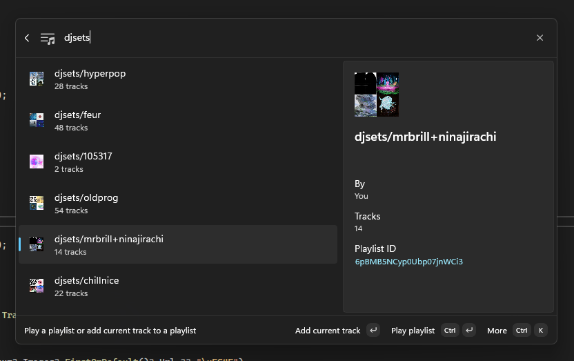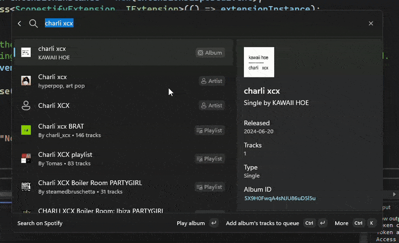 I stumbled upon this PowerToy, that happens to be extensible, meaning you can write your own commands! This was also a great opportunity to learn some C#, a programming language I had never used before. I quickly added a bunch of features, and I can now do almost anything I need from the command palette, without ever opening the Spotify app.